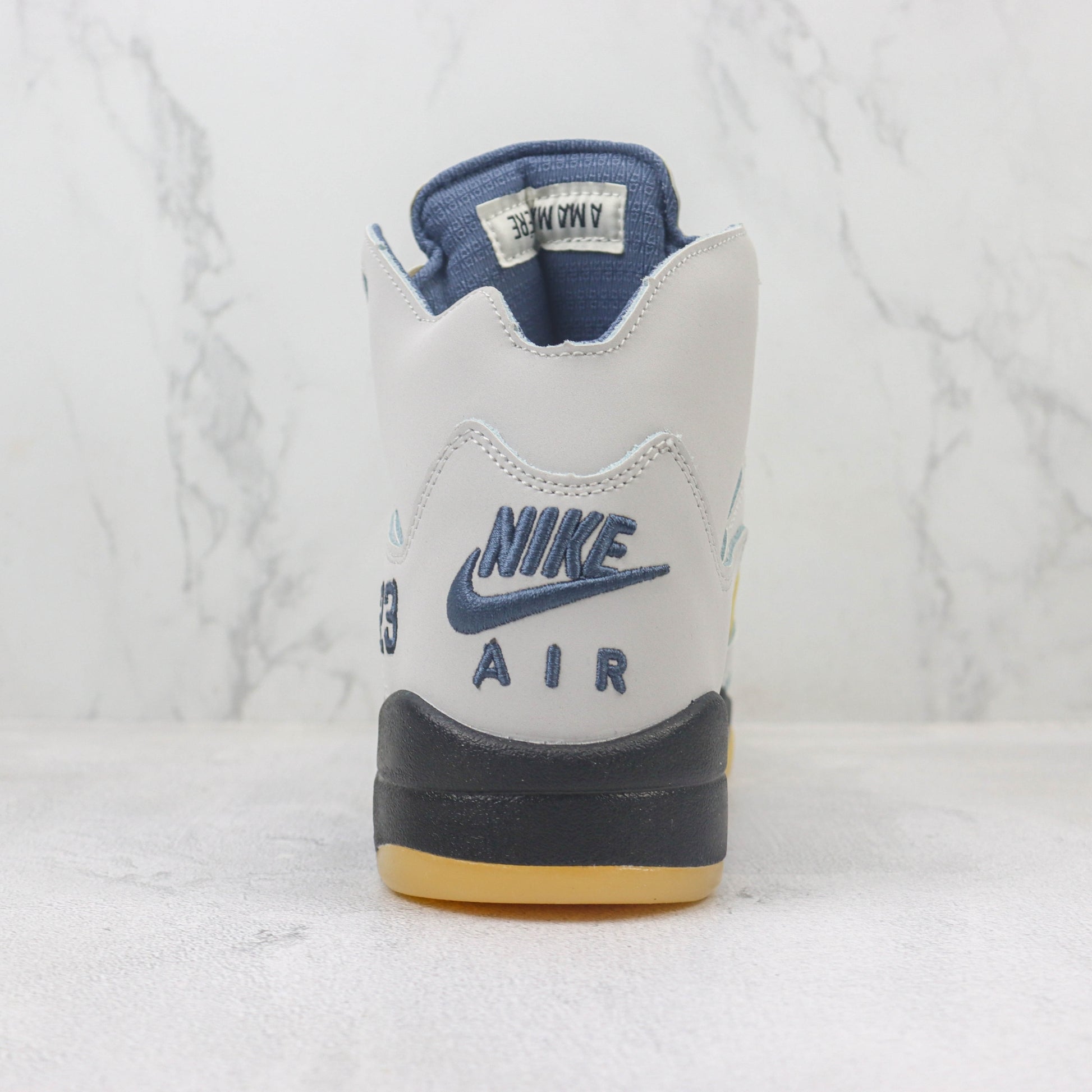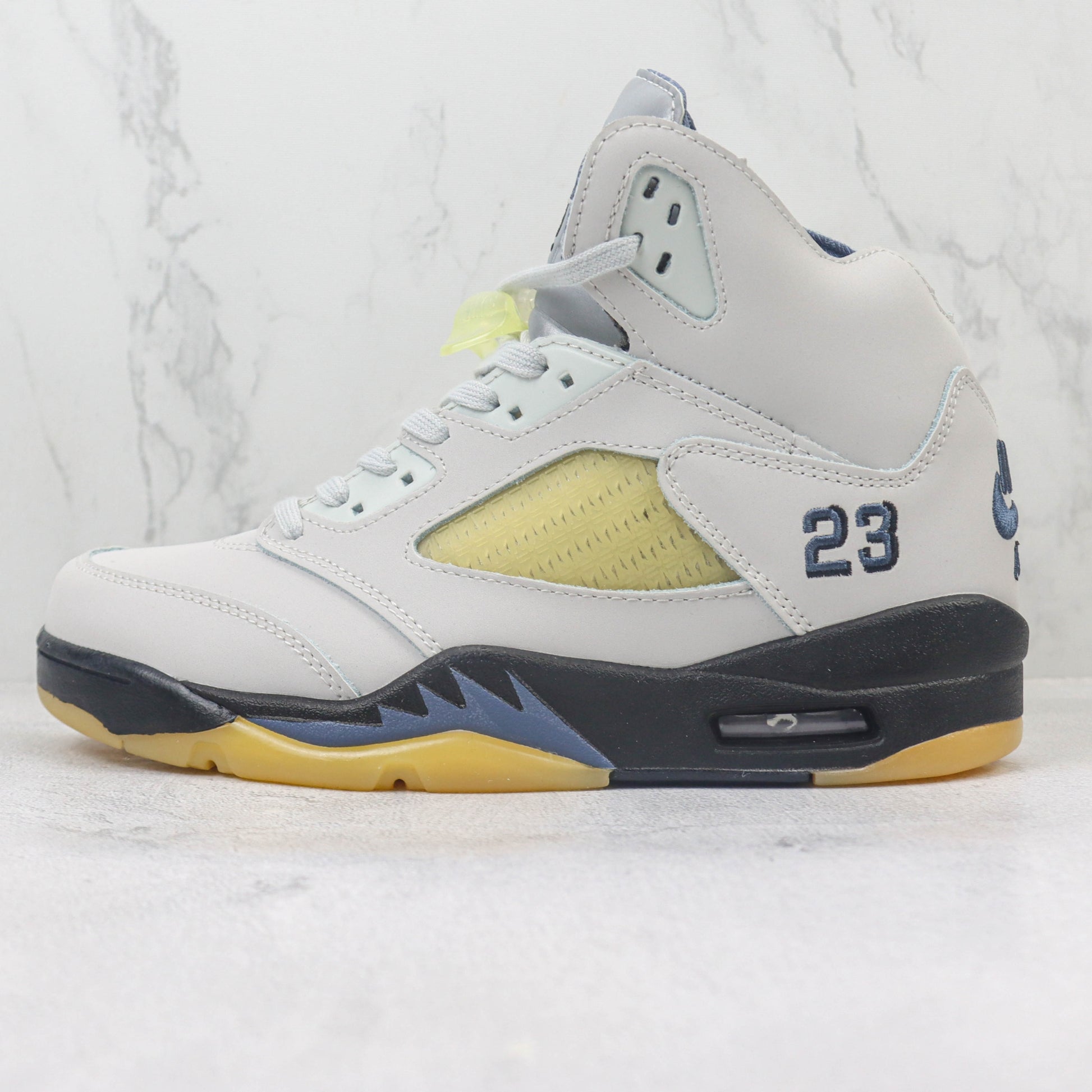 O sapato exibe uma mistura de cores: Photon Dust, Black, Diffused Blue e Pale Ivory. O Air Jordan 5 possui uma parte superior Photon Dust com detalhes contrastantes em Diffused Blue, uma deliciosa adição de cor feita sob medida para mulheres. A co-branding adorna as etiquetas da lingueta e a sola semitranslúcida de estilo vintage, que também se estende até a lateral e a rede da lingueta. Uma entressola preta conclui o design. O calçado estará disponível nos tamanhos feminino, pré-escolar e infantil, acompanhado de embalagem especial.