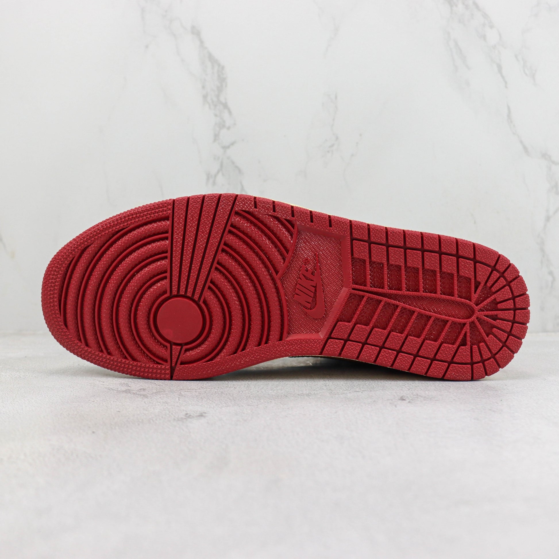 Com base em branco, vermelho e preto, a dupla traz invasões com aspecto envelhecido. Encontramos as marcas clássicas do logotipo Jordan With the Wing em cinza abaixo do link e o swoosh preto. Unir a marca da sua etiqueta a esta silhueta com uma etiqueta A amarela.